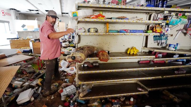 Tennessee flooding Carson Hollifield, manager of the produce department at the Waverly Cash Saver grocery store, walks past the store owner's office structure in the grocery Sunday, Aug. 22, 2021, in Waverly, Tenn. Hollifield climbed up on the office structure Saturday to escape flood waters that destroyed the store. (AP Photo/Mark Humphrey) (Mark Humphrey/AP)