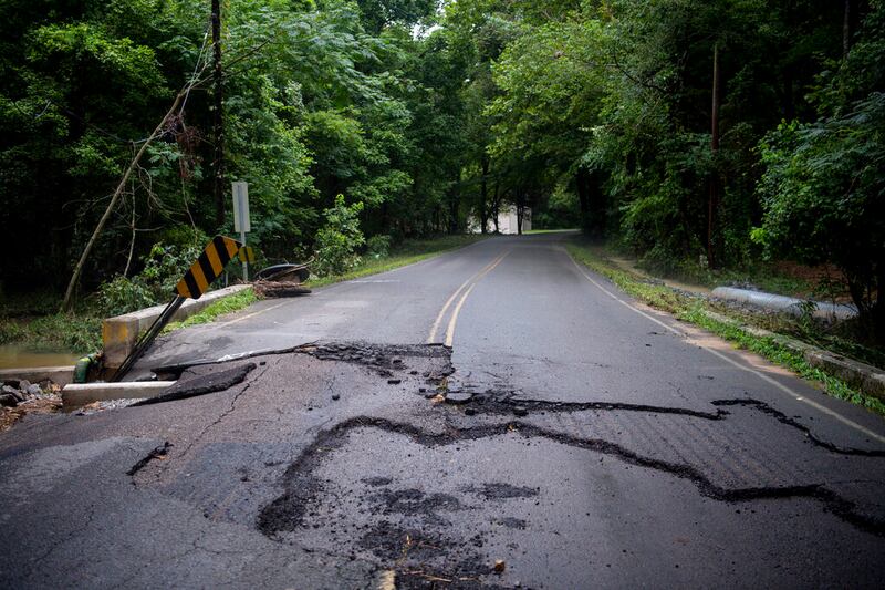 Tennessee flooding Layers of pavement are ripped up from Harris Road following heavy rainfall and flooding on Saturday, Aug. 21, 2021, in Dickson, Tenn. (Josie Norris/The Tennessean via AP) (Josie Norris/AP)