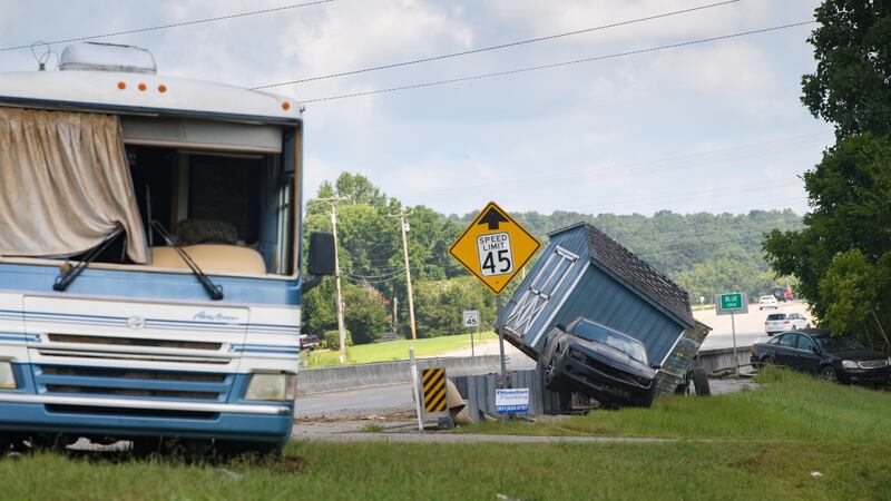 Tennessee flooding A shed, car, and RV came to a rest on Hwy 13, after being swept up in flood waters, shown Monday, Aug. 23, 2021, in Hurricane Mills, Tenn. Heavy rains caused flooding in Middle Tennessee days ago and have resulted in multiple deaths as homes and rural roads were washed away. (John Amis/AP Photo)