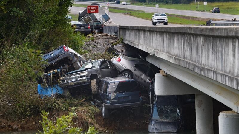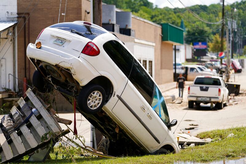 Tennessee flooding Cars are stacked on top of each other on the banks of Blue Creek being swept up in flood water, Monday, Aug. 23, 2021, in Waverly, Tenn. Heavy rains caused flooding in Middle Tennessee days ago and have resulted in multiple deaths as homes and rural roads were washed away. (John Amis/AP Photo)