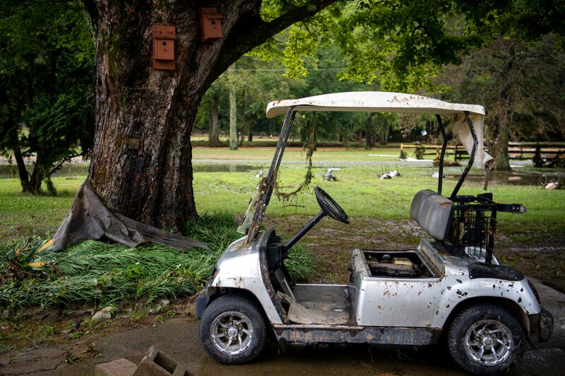 Tennessee flooding A muddy golf cart sits in a driveway of Gary and Joy Rhodes following heavy rainfall on Saturday, Aug. 21, 2021, in Dickson, Tenn. (Josie Norris/The Tennessean via AP) (Josie Norris/AP)