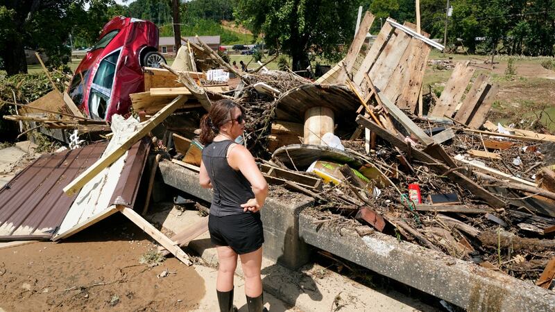 Tennessee flooding A woman looks at debris washed up against a bridge over a stream Sunday, Aug. 22, 2021, in Waverly, Tenn. Heavy rains caused flooding Saturday in Middle Tennessee and have resulted in multiple deaths as homes and rural roads were washed away. (Mark Humphrey/AP Photo)