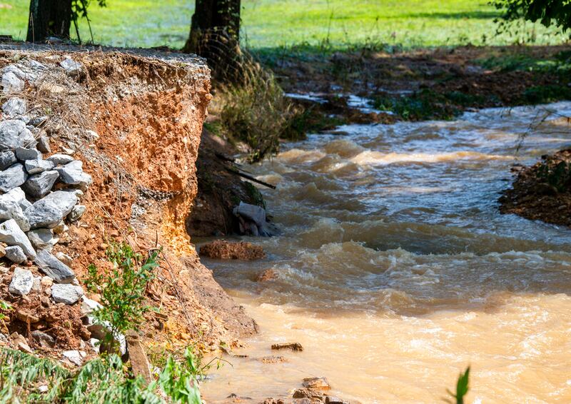 Tennessee flooding A driveway is washed away by flooding along Little Blue Creek Road following heavy rainfall Saturday, Aug. 21, 2021, in McEwen, Tenn. Heavy flooding in several Middle Tennessee counties on Saturday prompted water rescues, road closures, and communications disruptions, with several people reported missing. Flash flood warnings were in effect for Dickson, Houston and Montgomery and Stewart counties on Saturday evening. (Josie Norris/The Tennessean via AP) (Josie Norris/AP)