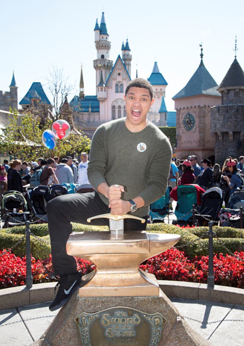 Through the years In this handout photo provided by Disney Parks, 'Daily Show' host Trevor Noah tries his luck at removing the Sword in the Stone in Fantasyland at Disneyland park February 24, 2017 in Anaheim, California. (Photo by Scott Brinegar/Disney Parks via Getty Images) (Handout/Getty Images)