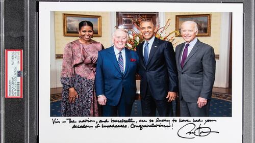Vin Scully collection President Barack Obama signed a photograph for Vin Scully during a White House visit in 2016. Also pictured are first lady Michelle Obama and Vice President Joe Biden. (Hunt Auctions)