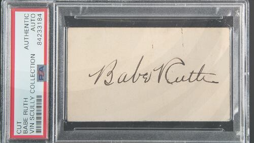 Vin Scully collection As a youth, Vin Scully got an autograph from home run king Babe Ruth during a game when the Bambino was a spectator at the Polo Grounds in New York. (Hunt Auctions )