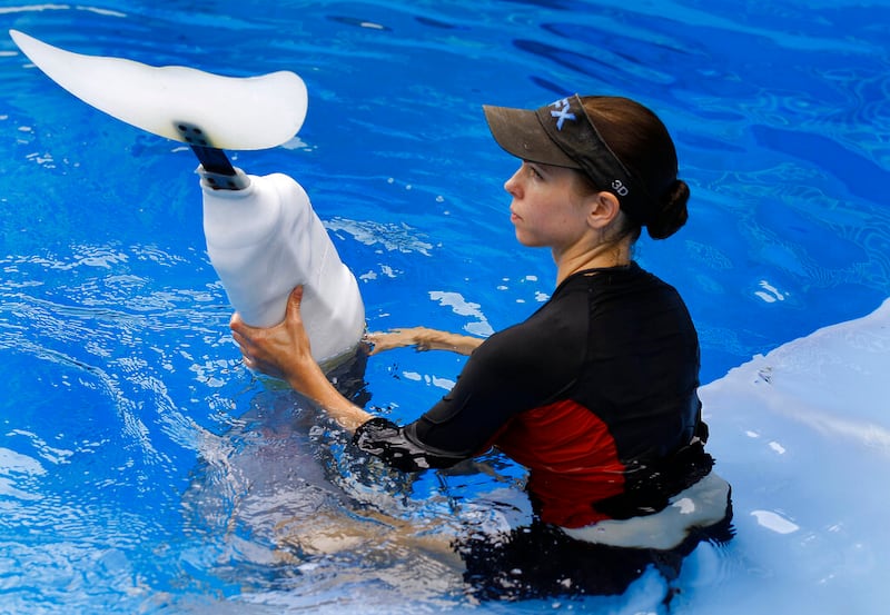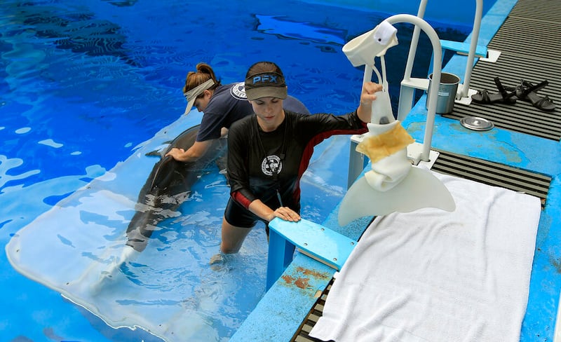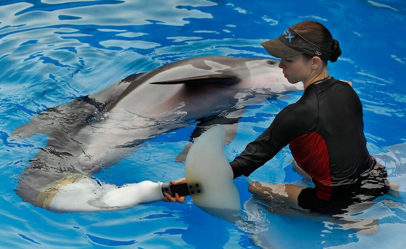 Winter the dolphin In this Aug. 31, photo, Clearwater Marine Aquarium senior marine mammal trainer Abby Stone fits Winter the dolphin with a prosthetic tail in Clearwater, Fla. The nonprofit public aquarium was about ready to go belly-up at the end of 2005 when Winter, the bottlenose dolphin was brought there after getting her tail tightly entangled in a crab-trap line. Winter plays herself in "Dolphin Tale," a family-friendly 3-D movie starring Harry Connick Jr., Morgan Freeman, Ashley Judd and Kris Kristofferson, opening Sept. 23.(AP Photo/Chris O'Meara) (Chris O'Meara/ASSOCIATED PRESS)