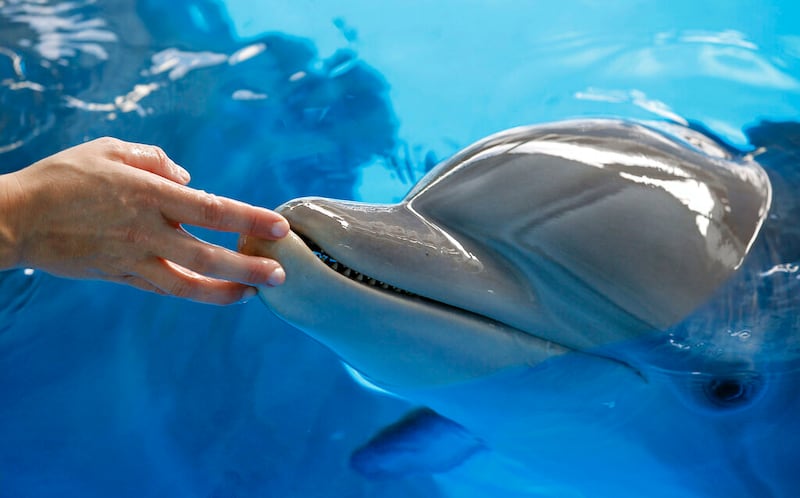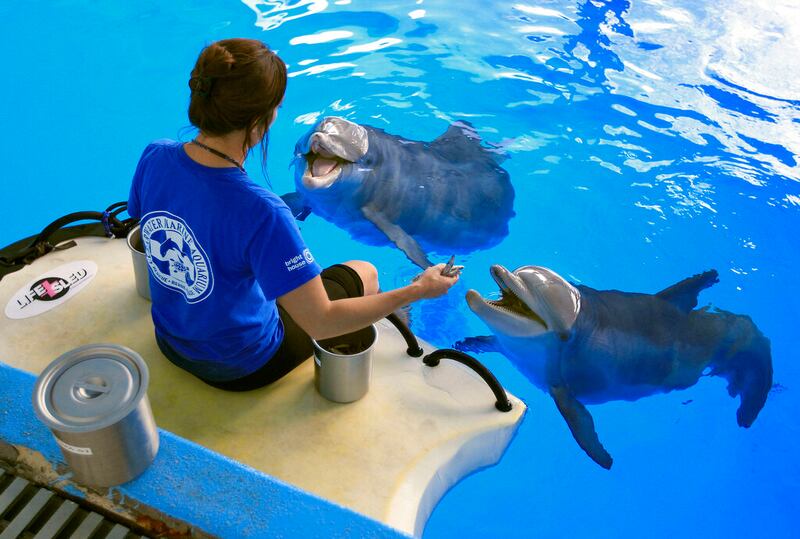 Winter the dolphin In this Aug. 31, photo, Clearwater Marine Aquarium trainer Cindy Farber reaches out to touch Winter the dolphin on the nose in Clearwater, Fla. The nonprofit public aquarium was about ready to go belly-up at the end of 2005 when Winter, the bottlenose dolphin was brought there after getting her tail tightly entangled in a crab-trap line. Winter plays herself in "Dolphin Tale," a family-friendly 3-D movie starring Harry Connick Jr., Morgan Freeman, Ashley Judd and Kris Kristofferson, opening Sept. 23. (AP Photo/Chris O'Meara) (Chris O'Meara/ASSOCIATED PRESS)