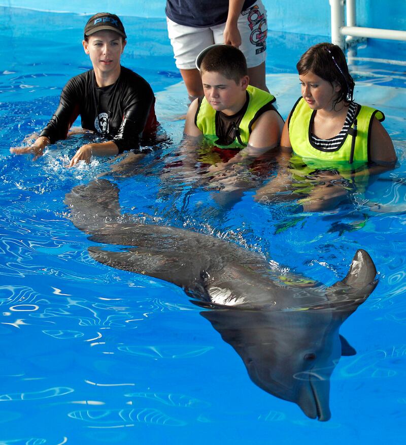 Winter the dolphin In this Aug 31, 2011 photo, Clearwater Marine Aquarium senior marine mammal trainer Abby Stone, left, shows Winter the dolphin to J.C. Barton, center, of Williamson, N.Y., and Kelsie Castagne, of Carmel, N.Y., in Clearwater, Fla. The nonprofit public aquarium was about ready to go belly-up at the end of 2005 when Winter, the bottlenose dolphin was brought there after getting her tail tightly entangled in a crab-trap line. Winter plays herself in "Dolphin Tale," a family-friendly 3-D movie starring Harry Connick Jr., Morgan Freeman, Ashley Judd and Kris Kristofferson, opening Sept. 23. (AP Photo/Chris O'Meara) (Chris O'Meara/ASSOCIATED PRESS)