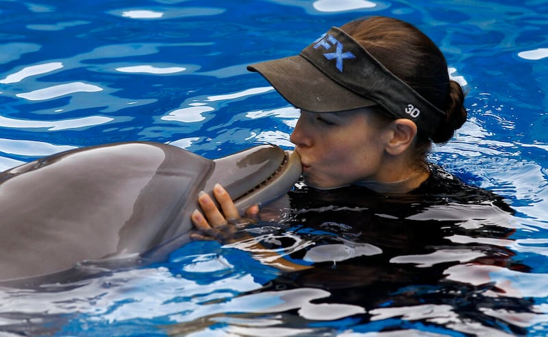 Winter the dolphin In this Aug. 31, photo, Clearwater Marine Aquarium senior marine mammal trainer Abby Stone kisses Winter the dolphin during a show Wednesday, Aug. 31, 2011, in Clearwater, Fla. The nonprofit public aquarium was about ready to go belly-up at the end of 2005 when Winter, the bottlenose dolphin was brought there after getting her tail tightly entangled in a crab-trap line. Winter plays herself in "Dolphin Tale," a family-friendly 3-D movie starring Harry Connick Jr., Morgan Freeman, Ashley Judd and Kris Kristofferson, opening Sept. 23. (AP Photo/Chris O'Meara) (Chris O'Meara/ASSOCIATED PRESS)