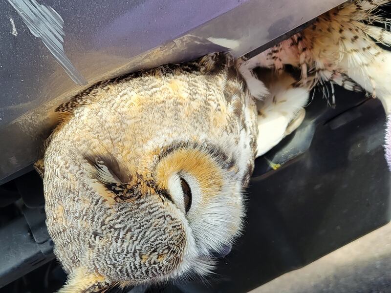Colorado Parks and Wildlife shared photos of the animal on social media, and said rescuers were called to a report of an owl stuck in a truck grille. Rescuers found the great horned owl both stuck and alive.