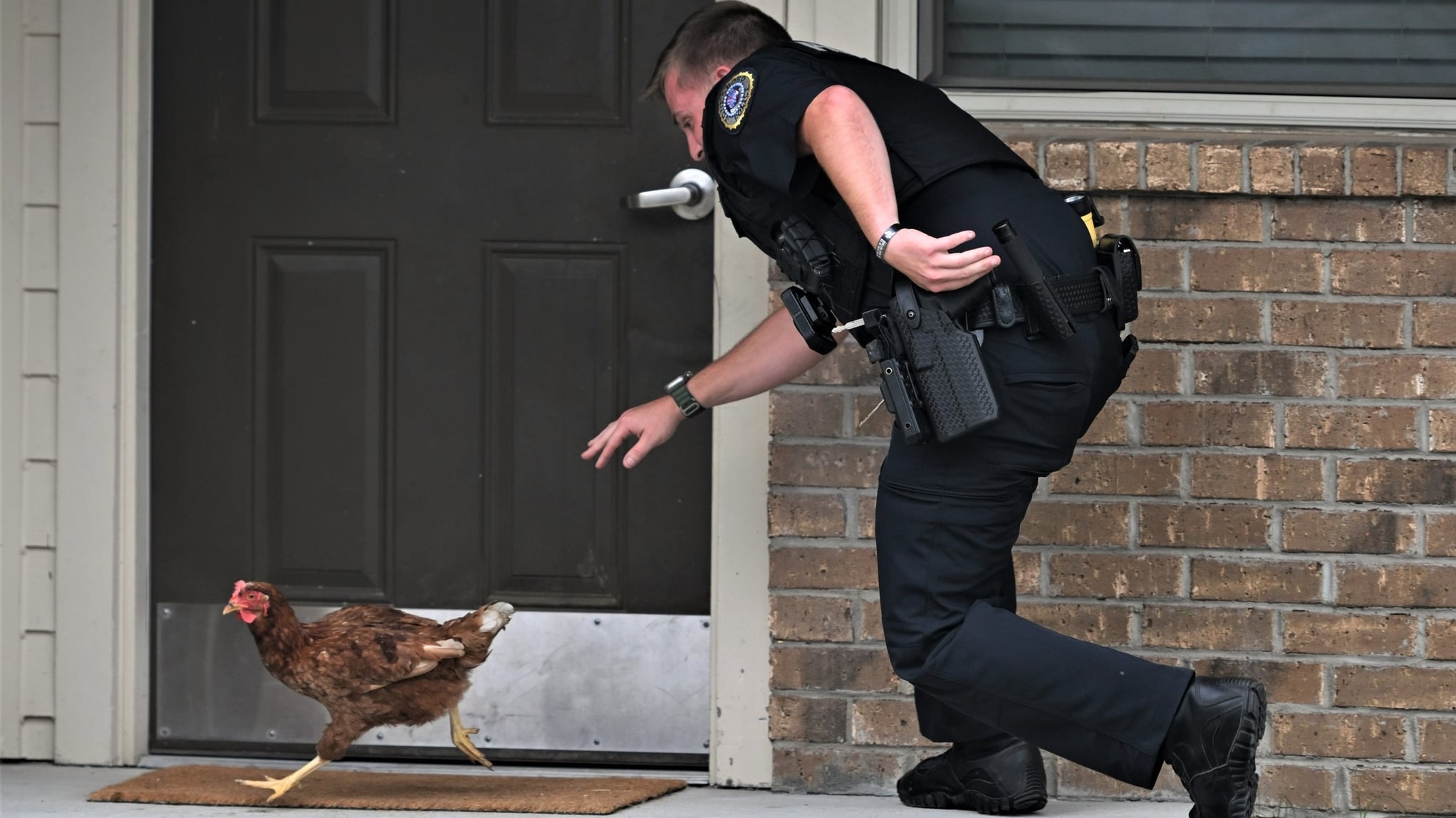 Officer Nathan Swindle and his training officer went out to the apartment. Swindle got out of his car and went up to the chicken, according to the news outlet.