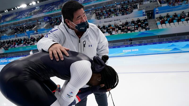 US speedskater Erin Jackson wins Olympic gold in 500m Erin Jackson of the United States reacts with coach Ryan Shimabukuro after winning the gold medal in the speedskating women's 500-meter race at the 2022 Winter Olympics, Sunday, Feb. 13, 2022, in Beijing. (Ashley Landis/AP Photo)