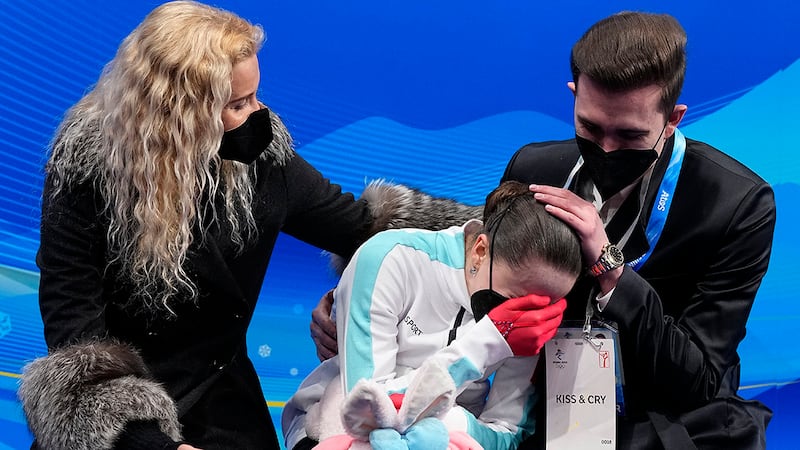 Women's free skate program at the Beijing Olympics Kamila Valieva, of the Russian Olympic Committee, reacts after competing in the women's free skate program during the figure skating competition at the 2022 Winter Olympics, Thursday, Feb. 17, 2022, in Beijing. (AP Photo/David J. Phillip) (David J. Phillip/AP)