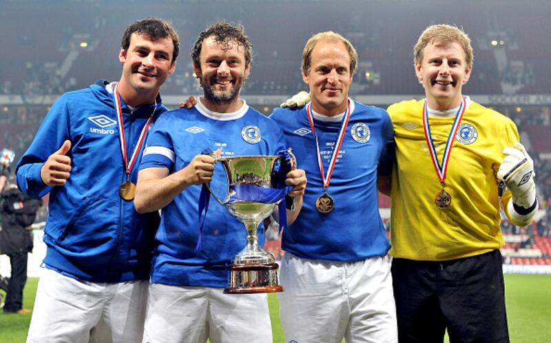 Woody Harrelson MANCHESTER, ENGLAND - JUNE 06: (L-R) Joe Calzaghe, Michael Sheen, Woody Harrelson and Patrick Kielty pose with the trophy at Soccer Aid in aid of UNICEF at Old Trafford on June 6, 2010 in Manchester, England. (Photo by Shirlaine Forrest/WireImage) (Shirlaine Forrest/WireImage)