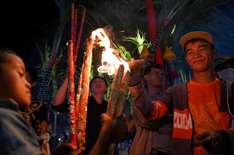Lunar New Year celebrated around the world Devotees light incense sticks at a temple to mark the start of the Lunar New Year in Ta Khmao, Kandal province on February 12, 2021. (TANG CHHIN SOTHY/AFP via Getty Images)