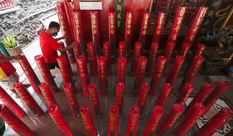 Lunar New Year celebrated around the world A worker moves giant candles in preparation for the upcoming Chinese Lunar New Year celebrations at Amurva Bhumi temple in Jakarta, Indonesia, Thursday, Feb. 11, 2021. (AP Photo/Achmad Ibrahim)