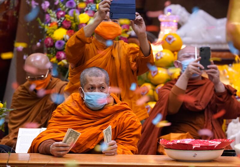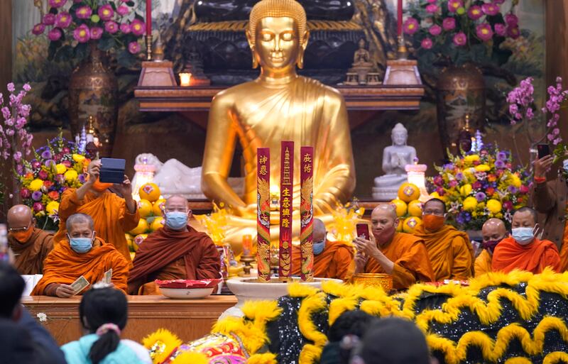 Lunar New Year celebrated around the world Buddhist monks wait to make an offering to performers with the JL Lion Dance Sports Association during a Lunar New Year celebration at Dao Quang Temple on Thursday, Feb. 11, 2021, in Garland, Texas. The celebration marks the Year of the Ox in the Chinese calendar. (AP Photo/LM Otero)