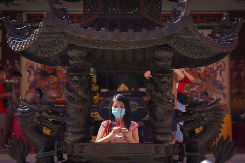 Lunar New Year celebrated around the world A woman wearing a protective mask prays at the Thean Hou Temple during first day of Chinese Lunar New Year celebrations in Kuala Lumpur, Friday, Feb. 12, 2021. The movement control order (MCO) currently enforced across the country to help curb the spread of the coronavirus, has been extended to Feb. 18, effectively covering the Chinese New Year festival that falls on Feb. 12 this year. (AP Photo/Vincent Thian)