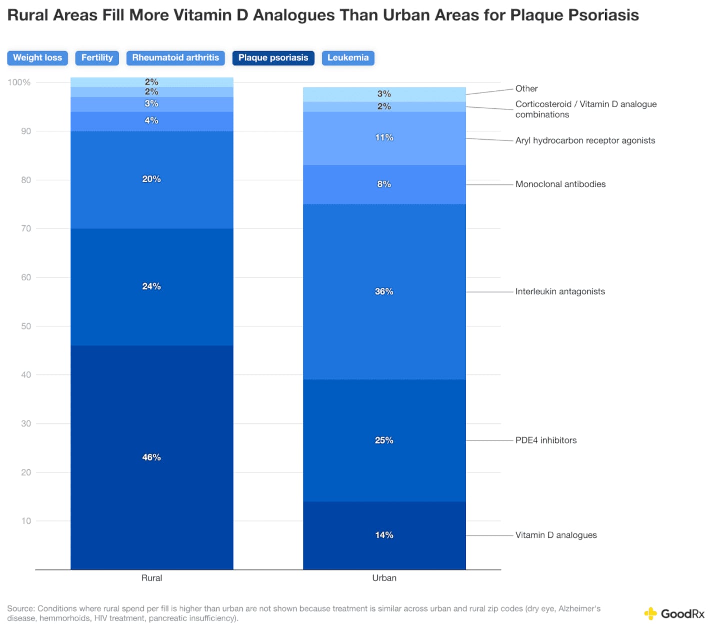 In rural areas, the most commonly prescribed medication for plaque psoriasis is calcipotriene, which is available in various topical forms. Insurance and cost barriers may lead to lower usage of other treatments. Adoption and implementation of newer medications may also be more prevalent in urban areas with higher concentrations of dermatologists. Zoryve and Vtama are two examples of topical treatments for plaque psoriasis that came to market in the last three years; they are filled more commonly in urban areas than rural areas.