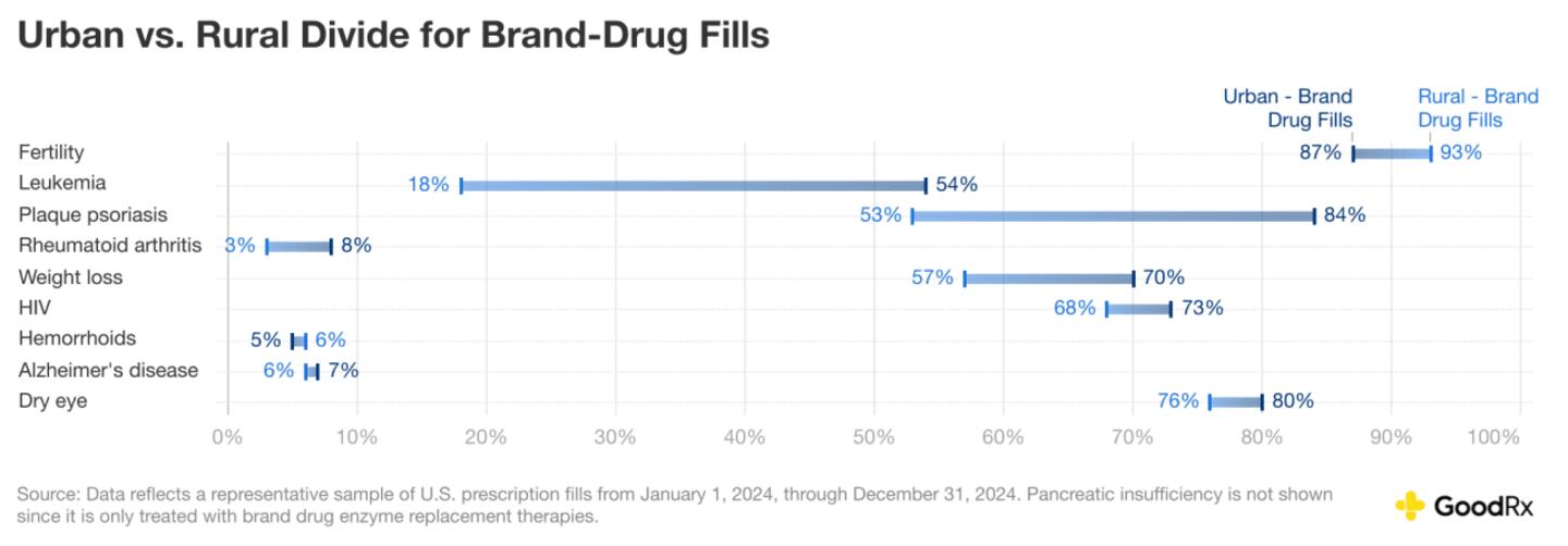 When it comes to leukemia medications, for example, people living in urban areas fill brand drugs three times more (over the course of a year) than people living in rural areas. Similarly, people in urban areas fill 30% more brand drugs for psoriasis and 13% more weight-loss brand medications than people in rural areas.
