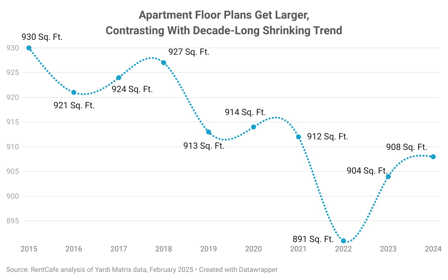 Just in time for the start of the moving season, bigger apartments are making a comeback, as hybrid and remote work along with suburban living turned "more space" into a coveted amenity. RentCafe.com's annual report on apartment size found that the average size of new apartments grew in 2024, reversing a decade-long trend of more compact living space.