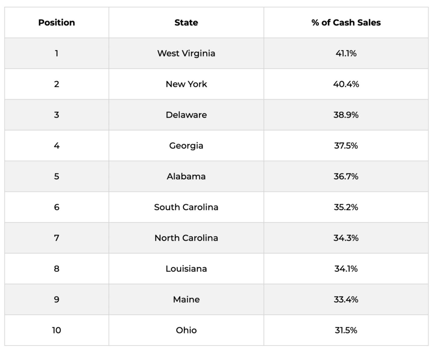 - West Virginia is the leader in cash sales, with about 41.1% of homes being sold for cash.