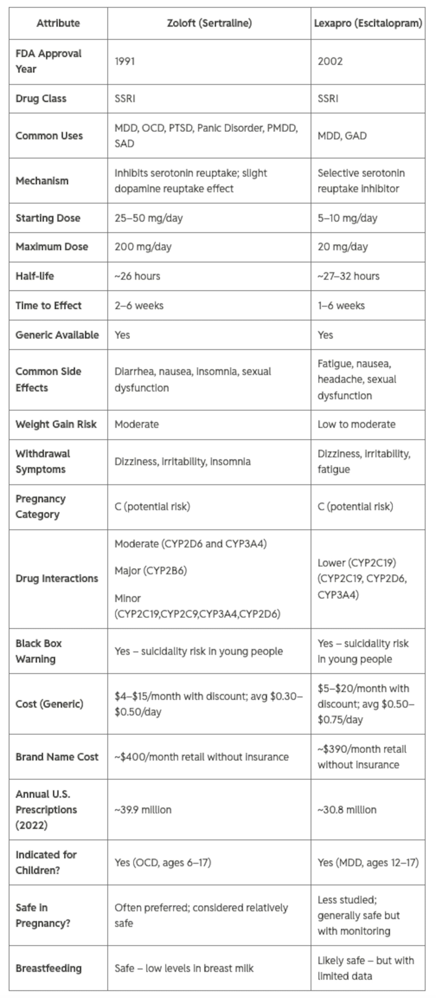 While it has fewer FDA-approved indications than Zoloft, Lexapro is known for its tolerable side effect profile and often a first line agent for physicians.