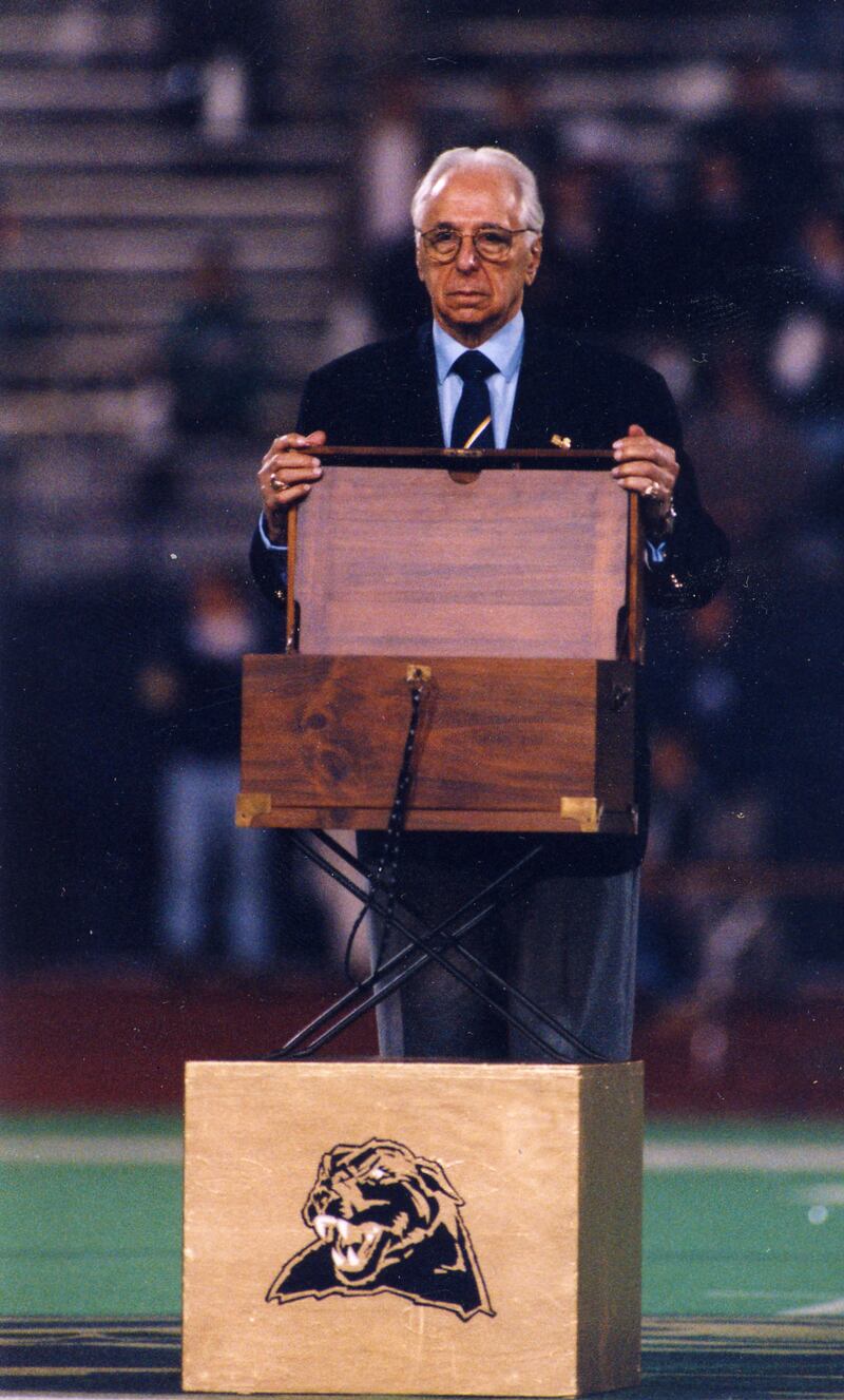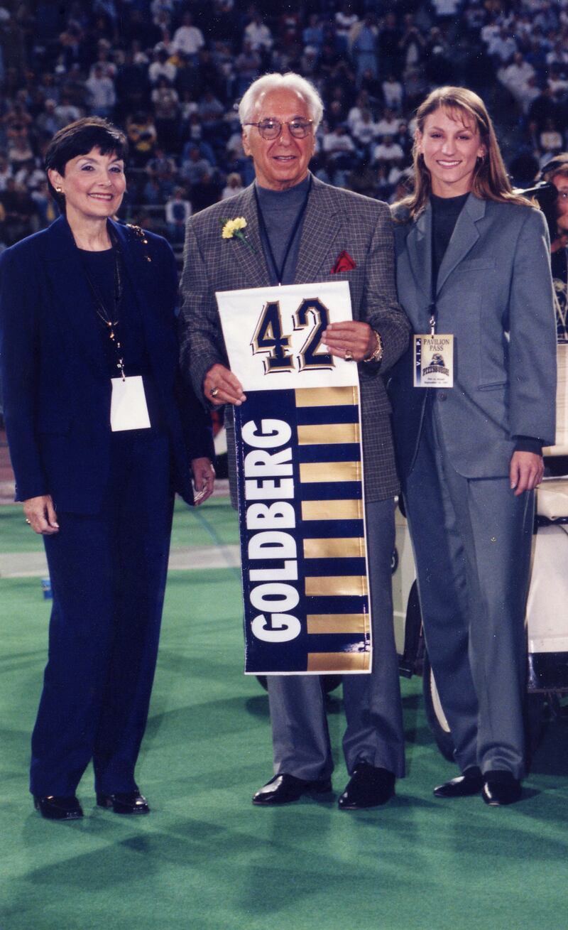 Goldberg is enshrined in the College Football Hall of Fame. The University of Pittsburgh retired his #42 in 1997. Two years later, at the last game at Pitt Stadium in Oakland, Goldberg was the honoree who symbolically “captured the spirit of Pitt Stadium” in a box during a ceremony at the end of the game. The “spirit” of the 60,000 fans in attendance still sits in the box in Pitt’s Hall of Fame at its practice facility on the South Side.