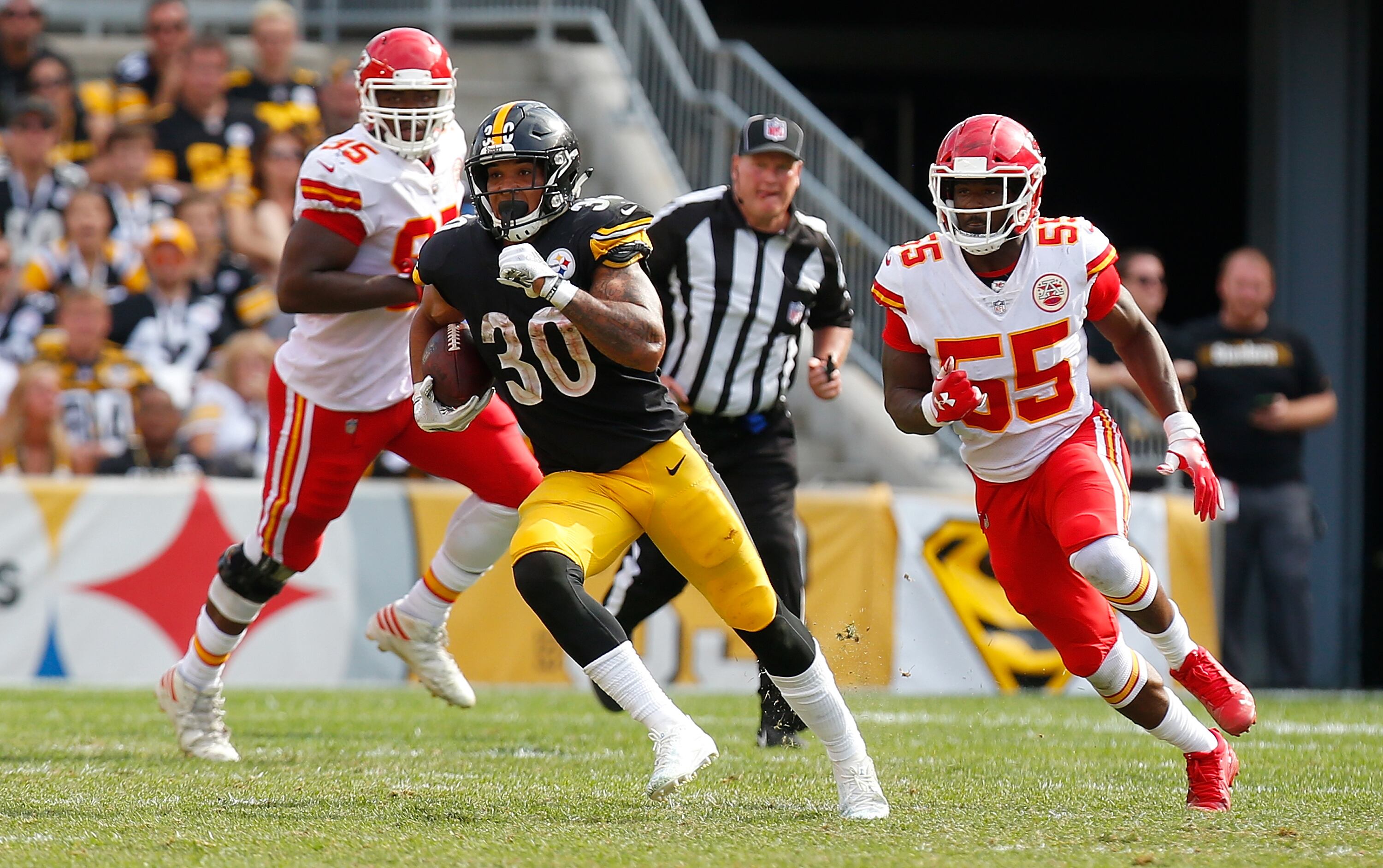 The Steelers received the break they needed to get back into the game when a Roethlisberger fumble that resulted in a Kansas City touchdown was waved off due to a defensive penalty. Pittsburgh reeled off touchdowns on its next three possessions to pull even at the break.