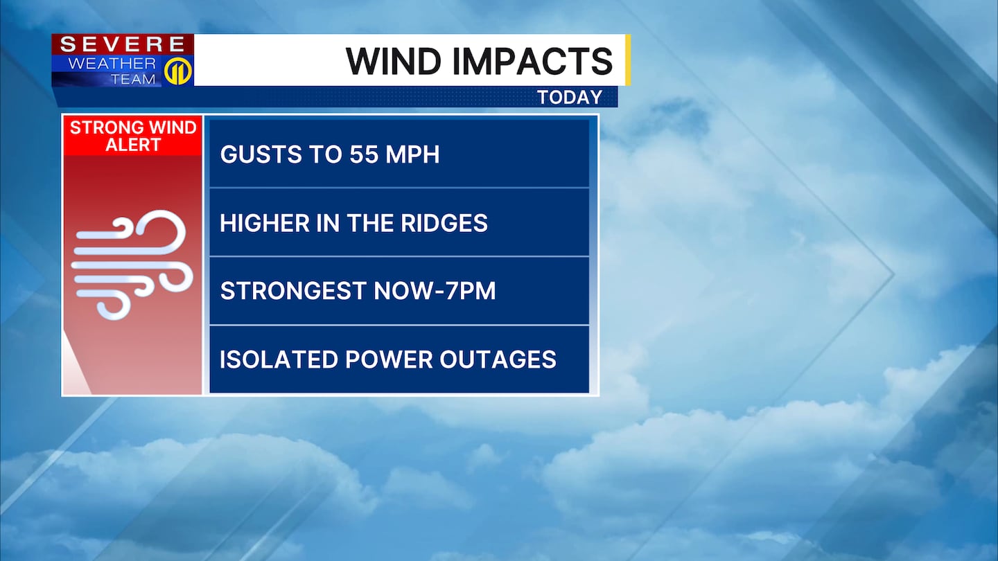 PITTSBURGH — A High Wind Warning has been issued for Washington, Westmoreland, Allegheny, Beaver, Butler, Armstrong and counties north through midnight. Wind gusts as high as 50 t0 60 mph will be possible, continuing the threat for power outages. A Wind Advisory continues for the rest of the viewing area with gusts to 40 mph possible.