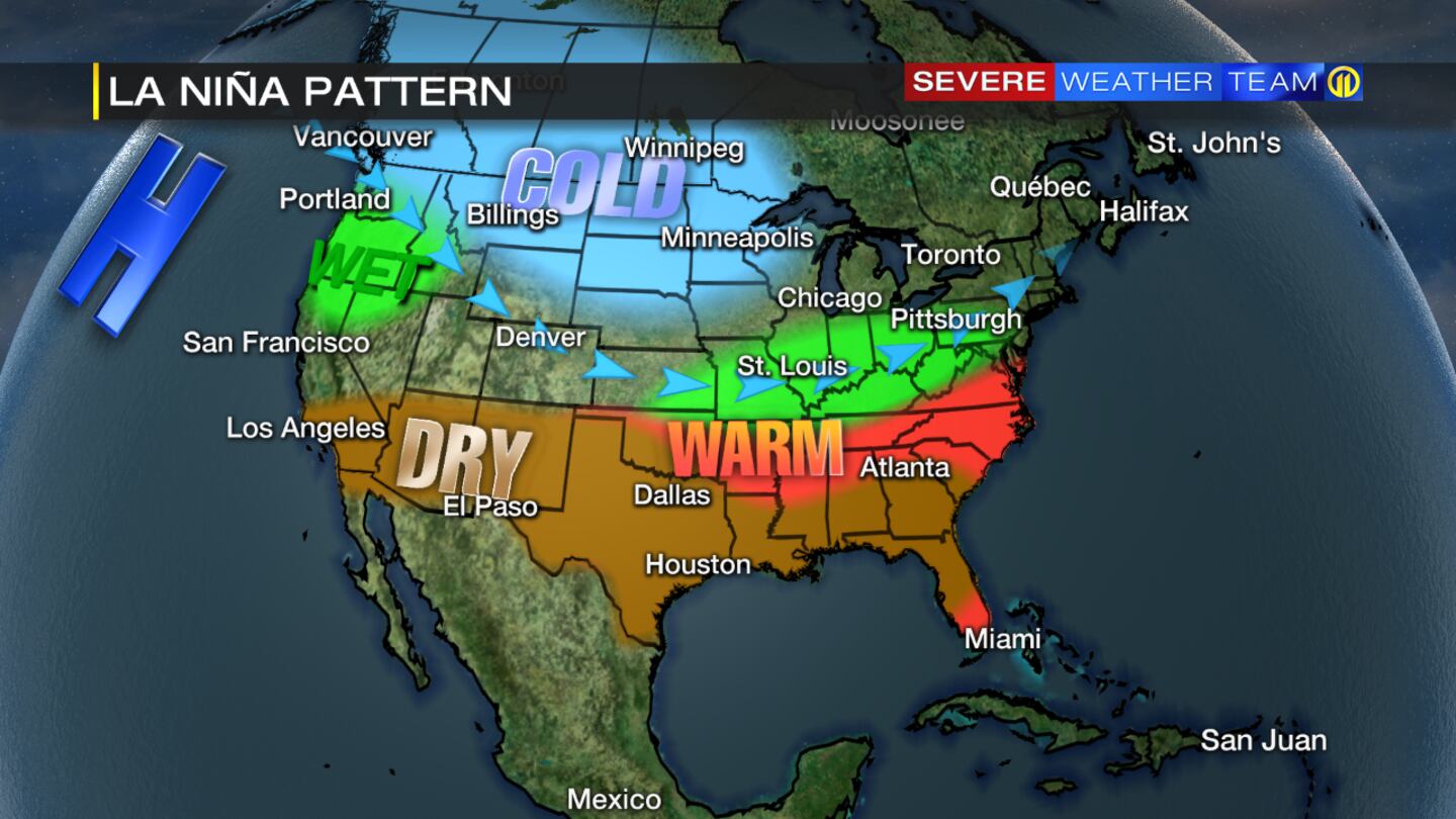 La Niña is the cooling of sea surface temperatures in the equatorial Pacific Ocean. This, in turn, leads to certain changes in our weather pattern that affects our daily weather across the mainland U.S. A La Niña typically leads to warmer and wetter than average conditions for western Pennsylvania.